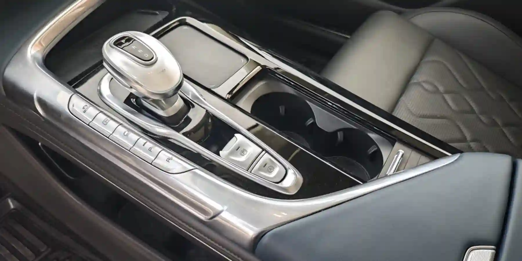 Джойстик управления движением с овальной рукояткой хорошо ложится в руку. Рядом с ним, на верхнем «этаже» парящей консоли нашлось место для тачпада (!), беспроводной зарядки (не самое удобное расположение) и пары подстаканников.