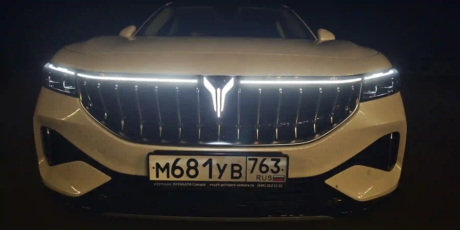 Весьма оригинальны габаритные огни VOYAH ФРИ / FREE. Передок машины украшает узкая белая светодиодная полоска во всю ширину кузова. В центре эту линию прерывает крупный светящийся логотип VOYAH.