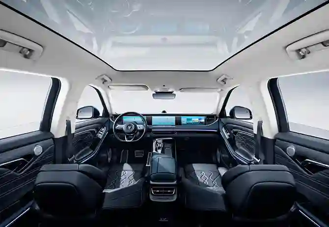 Круглую штуковину над центральной консолью я поначалу принял за часы, но никакого циферблата тут не оказалось. Потому что это - салонная камера. В России она может лишь снимать происходящее в салоне, а еще - контролировать усталость водителя. В Китае у нее есть еще функция Face ID, и для того, чтобы запустить машину, даже ключ в кармане не нужен. В потолок встроена еще одна камера – для наблюдения за задними пассажирами; изображение можно вывести на центральный или правый дисплей. Удобно – всегда знаешь, чем там заняты твои дети… Есть, конечно, и обычный видеорегистратор, а также инфракрасная система ночного видения (она входит в базовое оснащение). Ее «дальнобойность» – 150 - 200 м. На фоне всех этих «фишек», наверное, бессмысленно рассказывать о современных системах помощи водителю, безопасности и комфорта. Их список поистине бесконечен… Добавлю лишь, что огромная панорамная крыша тут лишена шторки. Она не нужна – электрохромное стекло меняет степень светопропускания по погоде и желанию водителя (всего предусмотрено 10 уровней).