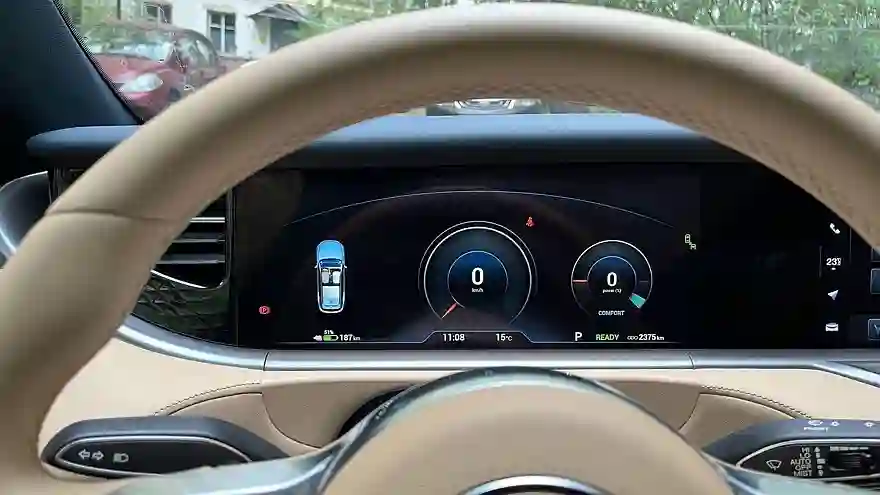 В салоне две широкоугольные салонные камеры, передняя с функцией face id. Каждая направлена на свой ряд сидений, можно делать селфи. Но это «побочный эффект», а основная задача – следить за водителем (система контроля усталости) и сидящими сзади детьми (изображение можно вывести на центральный или правый дисплей). Фронтальная камера обеспечивают и функцию видеорегистратора.