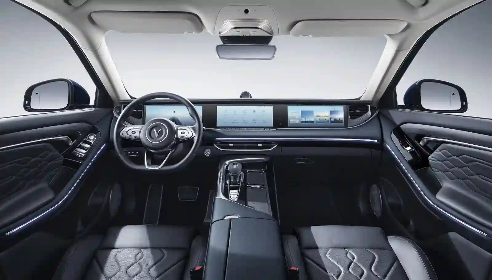 Интерьер скроен по лучшим канонам премиум-класса — двухцветная отделка (доступно три цветовые комбинации), экокожа (нет, не ради экономии, а ради окружающей среды), огромные экраны мультимедиа, удобная посадка, идеально подогнанные детали, тишина в салоне и многое-многое другое.