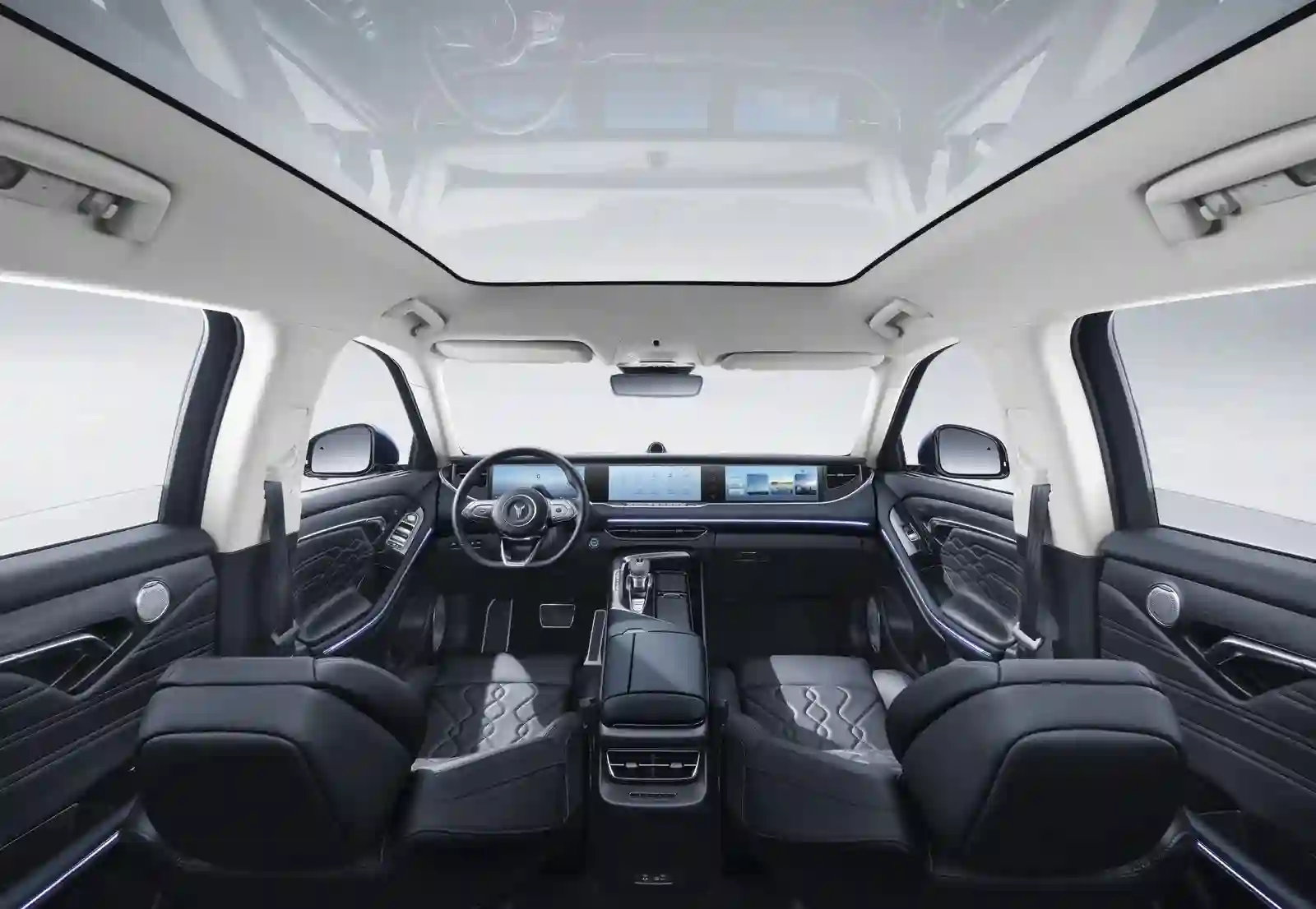 Классная штука — электрохромная панорамная крыша. К слову, такая же технология применяется в самолетах Boeing. Нажатием всего одной кнопки ее можно затемнить (точнее — сделать молочно-белой) или сделать полностью прозрачной. Производитель заявляет, что это самая большая панорамная крыша среди серийных автомобилей. Интересное решение, но страшно представить, во сколько обойдется ремонт в случае чего.